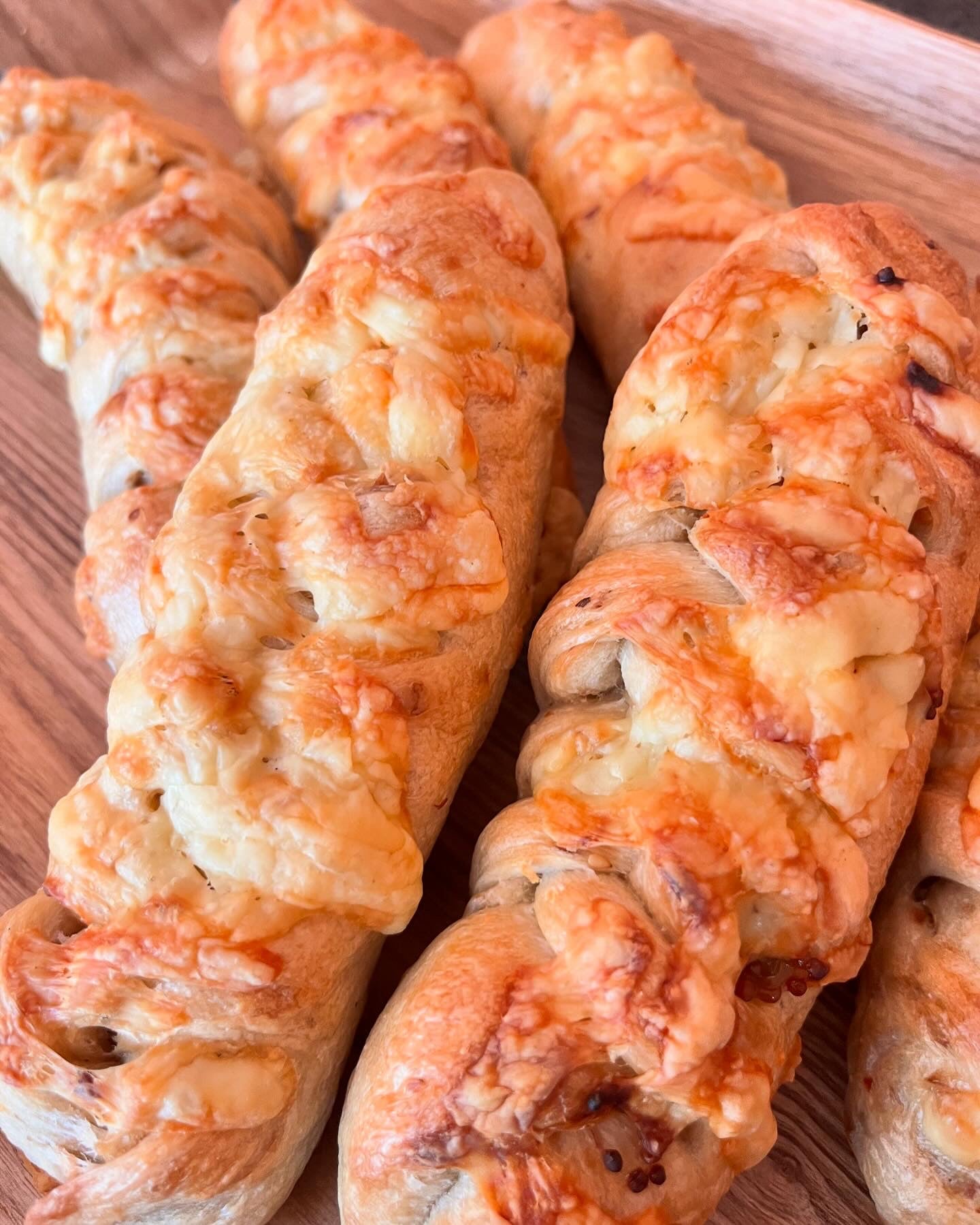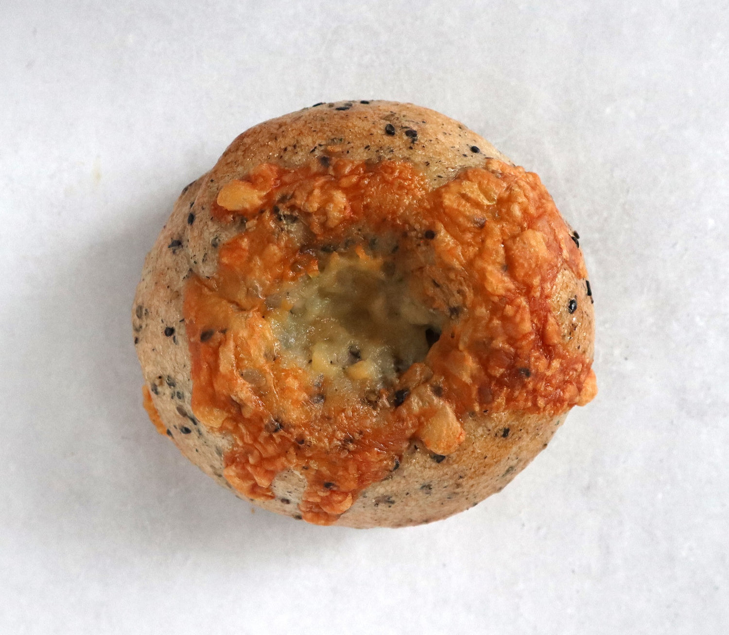 黒ごま生地にチェダーチーズ、クリームチーズ、ゴーダチーズの3種類のチーズをたっぷりと巻き込みました。