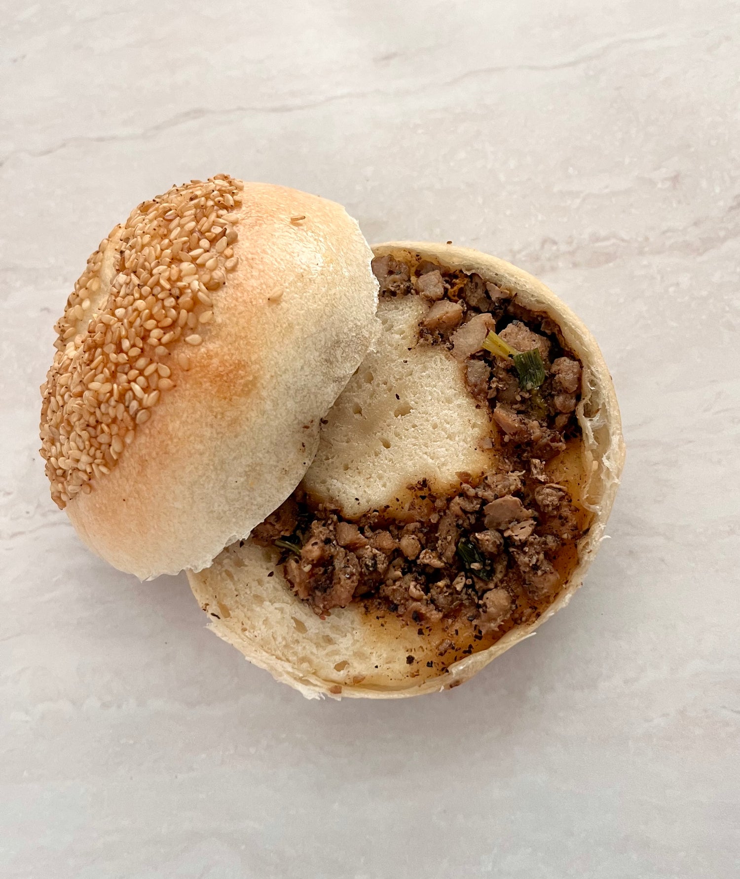 台湾の屋台料理の定番、胡椒餅をベーグルにしました。プレーン生地に胡椒の効いた甘辛い豚ミンチがたっぷりと巻き込まれています。