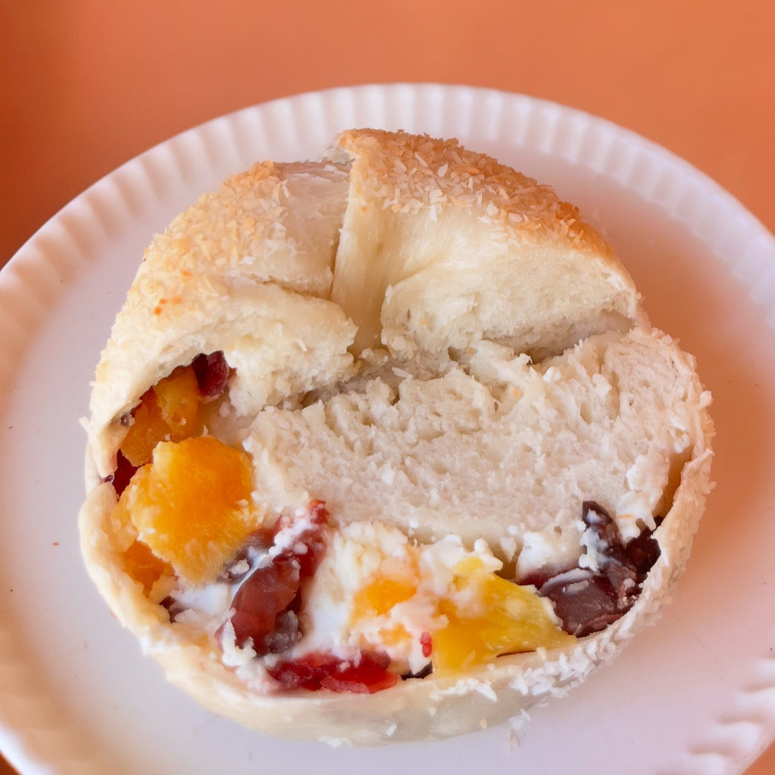 鹿児島の白くまアイスをイメージしたベーグルです。ココナッツ生地にミルキーなクリームチーズ、大納言、パイン、クランベリーを巻き込みました。