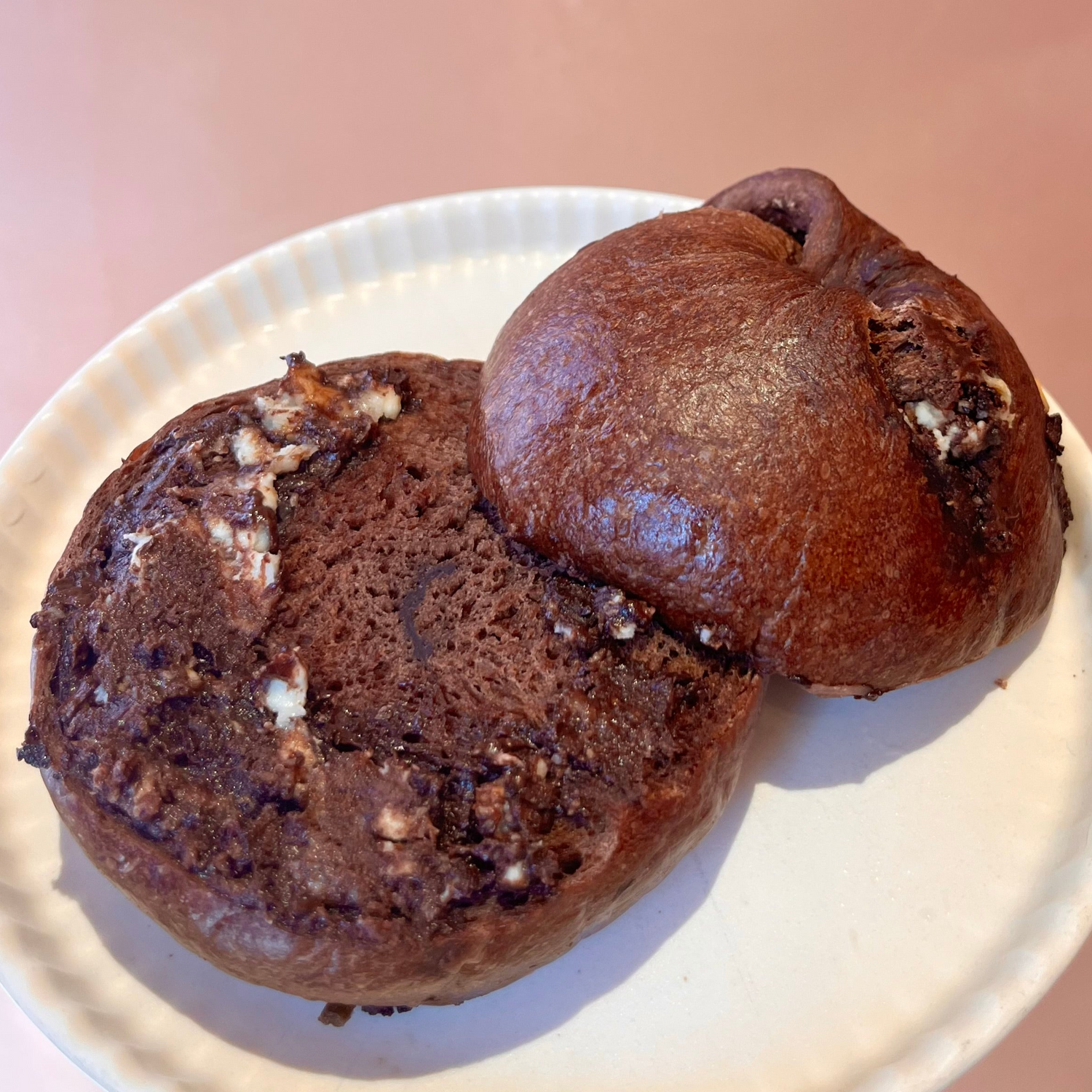 チョコ生地にビターなクーベルチュールチョコレートとホワイトチョコチップを入れました。温めていただくとチョコがトロッと溶け出します。