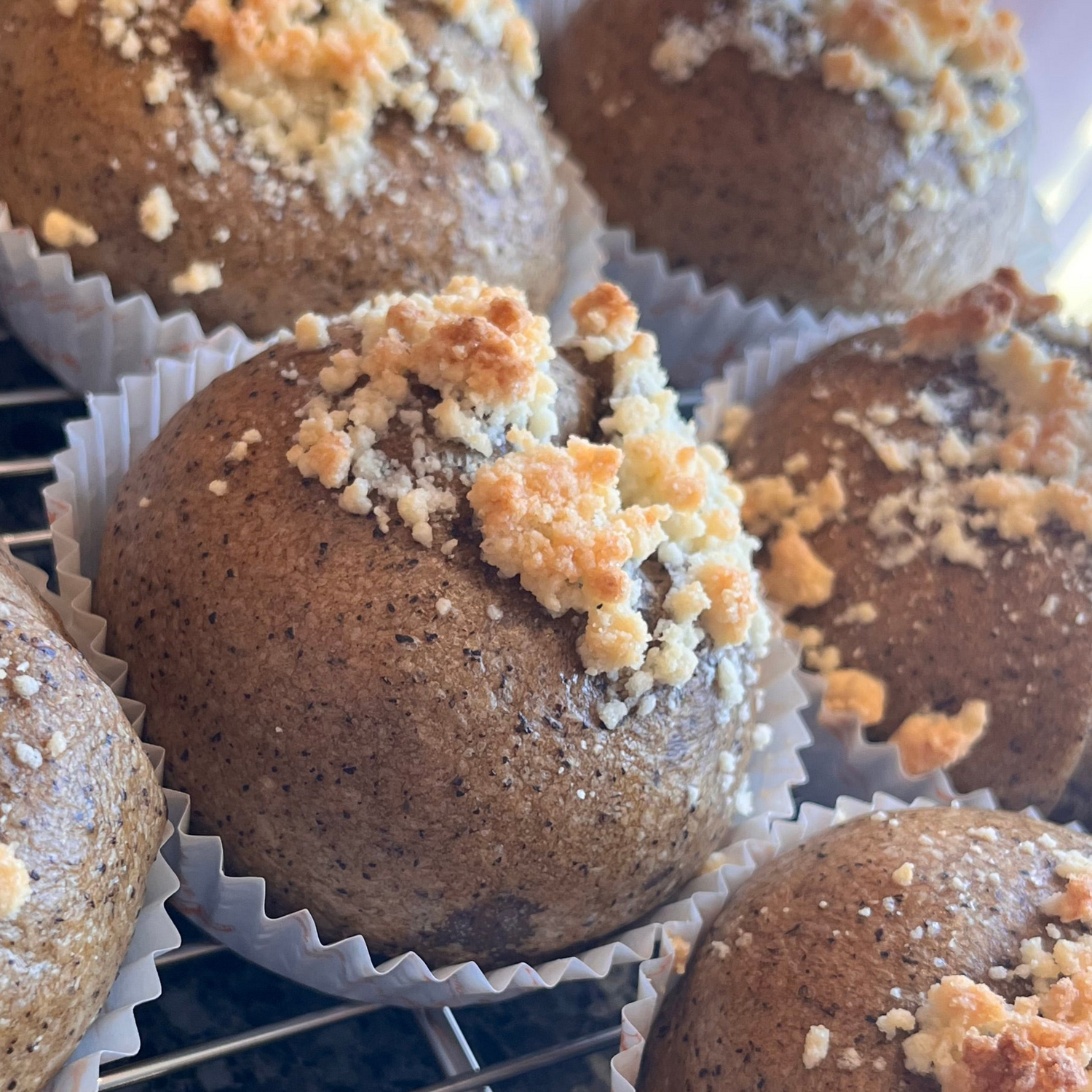 アールグレイが香る生地に、サクサクとした食感の塩キャラメルとクリームチーズを巻き込み、クランブルをかけて焼き上げました。