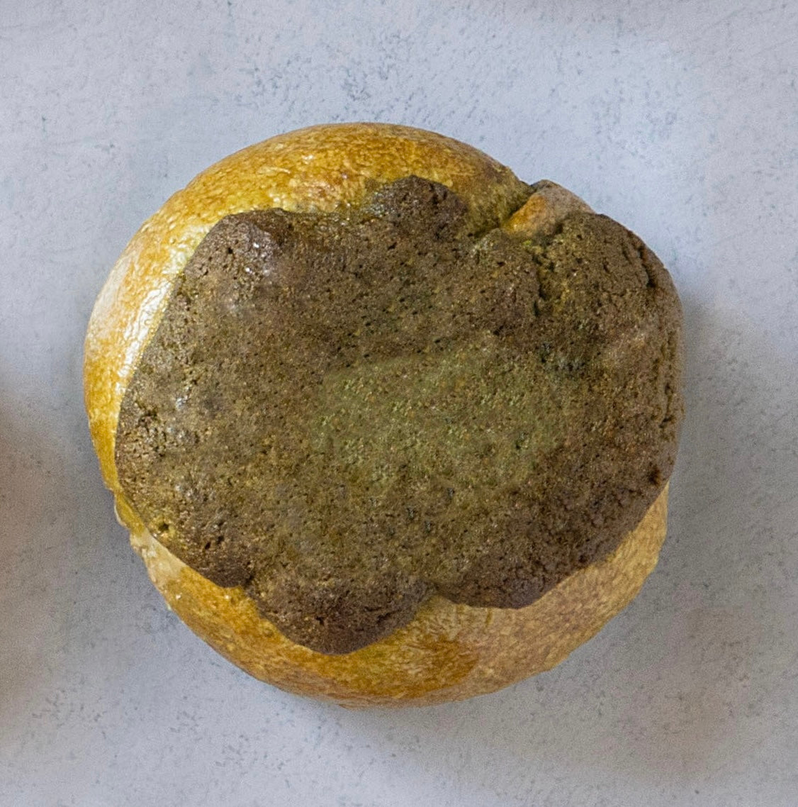 西尾の抹茶を使用した生地に丹波の黒豆とホワイトチョコを巻き込み、ほろ苦い抹茶のダマンドをかけて焼き上げました。