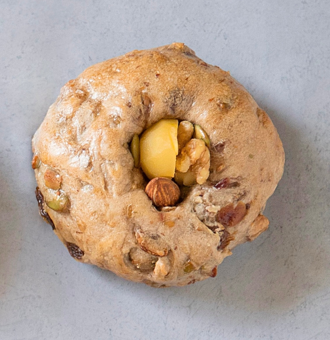 アーモンド、クルミ、クランベリー、レーズンなど、、、とにかくナッツとフルーツがぎゅっと詰め込まれた贅沢なベーグルです。