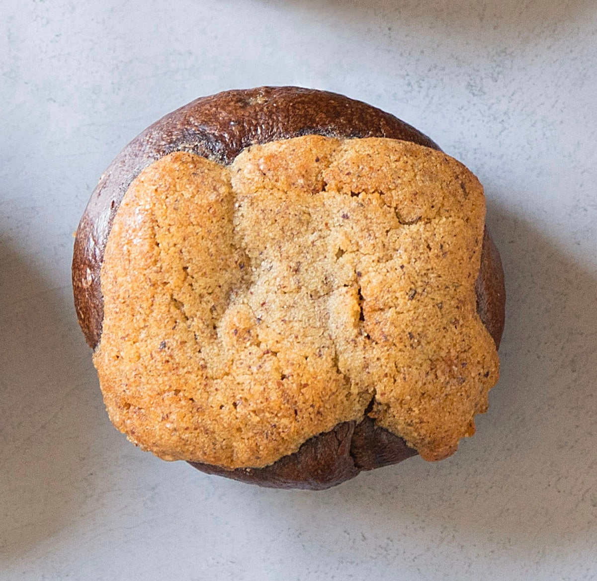 イタリアのカファレル社が作り出したヘーゼルナッツチョコレート「ジャンドゥーヤ」をイメージしています。ビターなチョコ生地にキャラメルチョコとヘーゼルナッツを巻き込み、ヘーゼルナッツのダマンドをかけました。ナッツのコクと香ばしさが美味しいベーグルです。